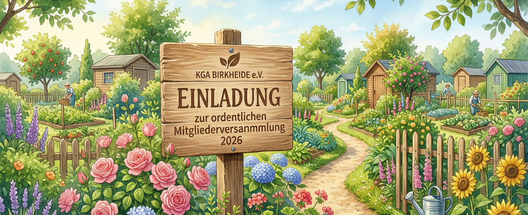 Anträge zur nächsten Tagesordnung: Bis spätestens eine Woche vor der Versammlung schriftlich per E-Mail an vorstand@kga-birkheide.de einreichen. Vorstellung erfolgt im Herbst.